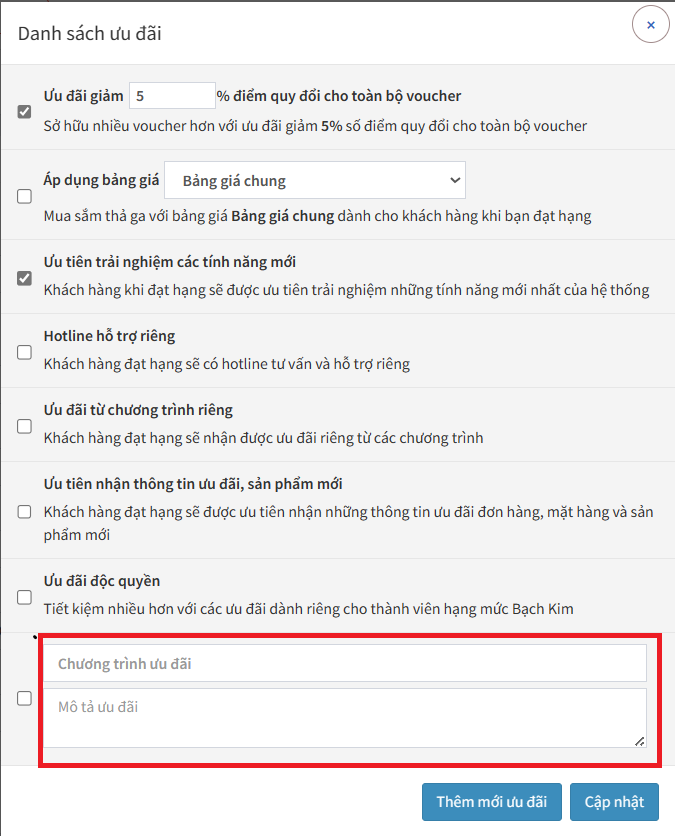 * Thêm mới ưu đãi: để thực hiện Tạo thêm ưu đãi cho phân hạng khách hàng -> Sau đó chọn **Cập nhật** để lưu thông tin