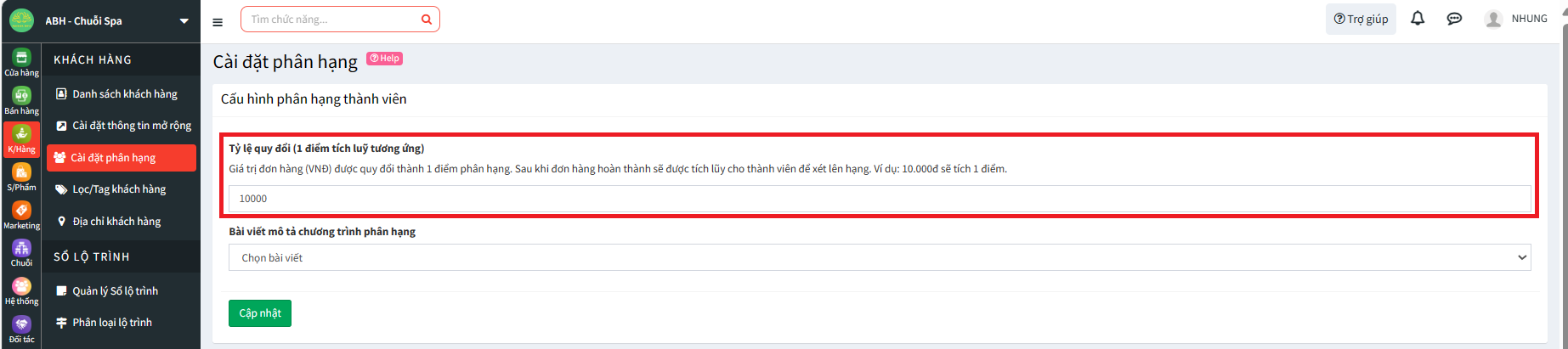 Quản trị cửa hàng cài đặt “Tỉ lệ quy đổi” bằng cách nhập giá trị vào ô Tỷ lệ quy đổi với đơn vị là VNĐ -> Bấm **Cập Nhật** để lưu thông tin.