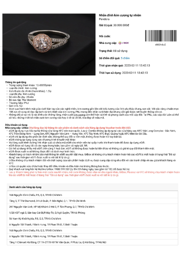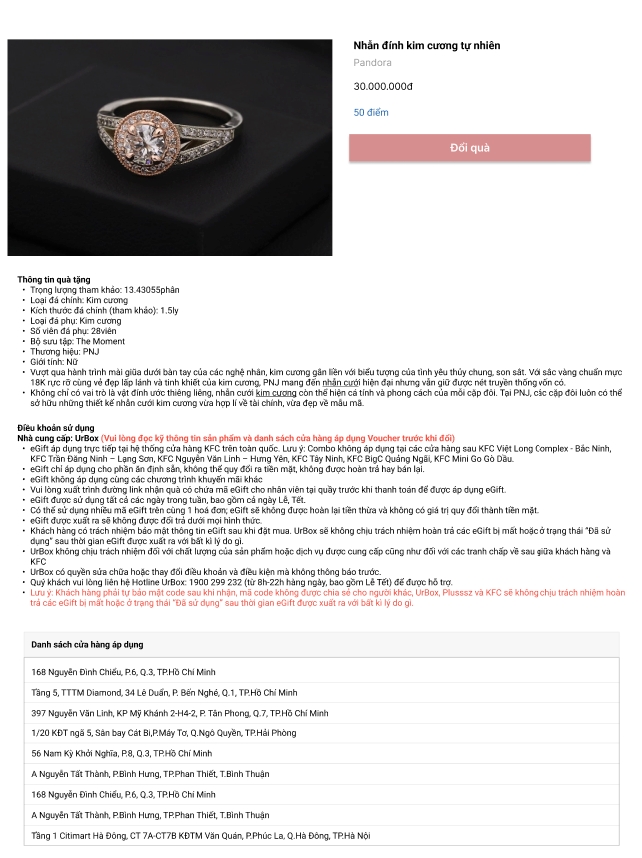 Thông tin quà tặng: Tên, thương hiệu, giá trị quà, số điểm đổi quà, thông tin quà tặng, điều khoản sử dụng, Danh sách điểm bán áp dụng đổi quà tặng