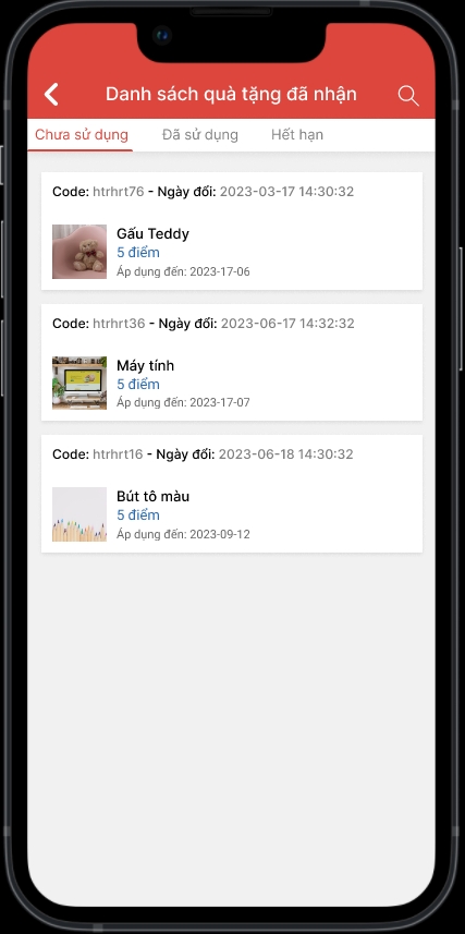 Trên app hiển thị trang Danh sách quà tặng đã đổi như sau: