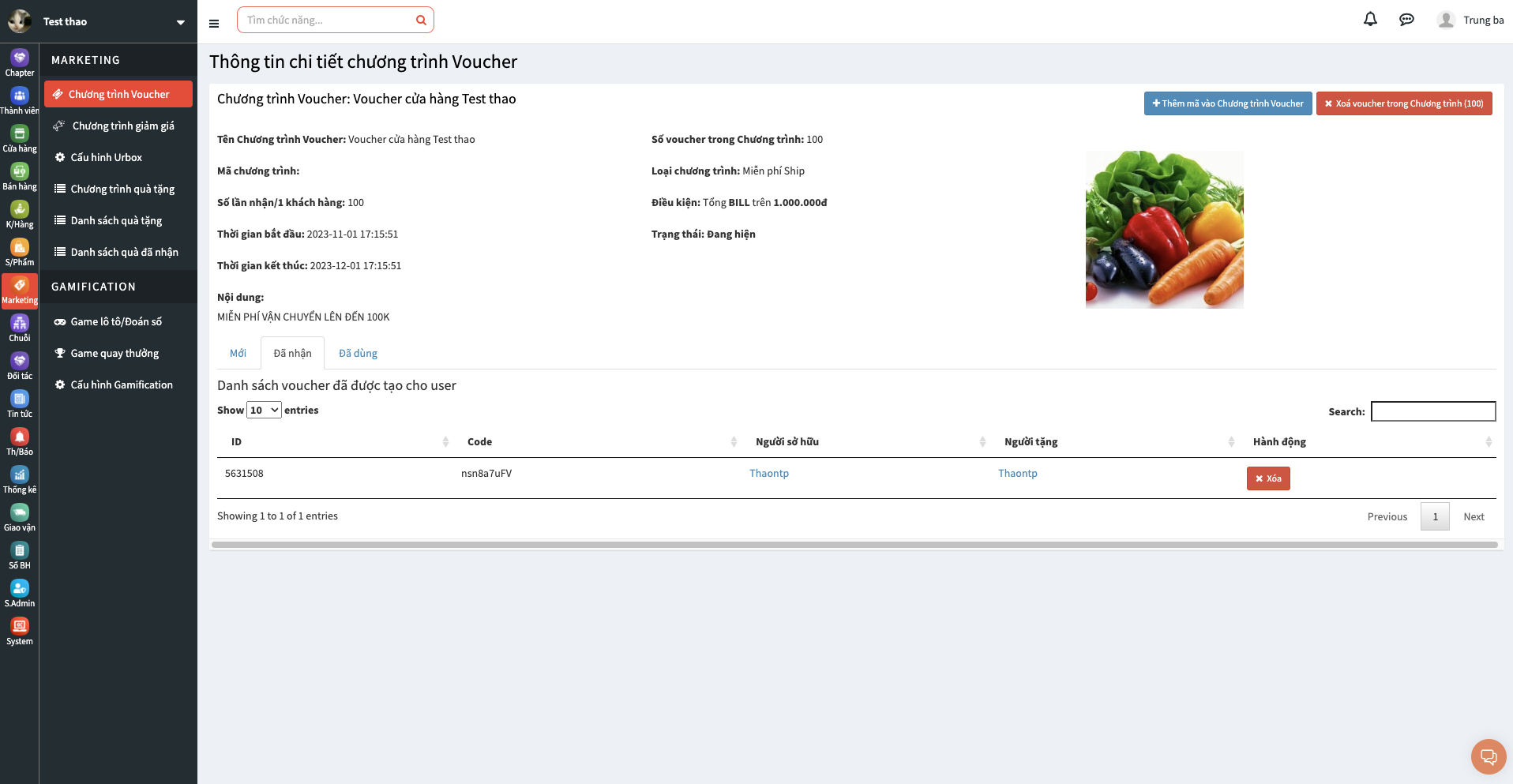 Admin truy cập vào "Thông tin chi tiết chương trình Voucher" và chọn "Đã nhận" để xem "Danh sách voucher được tạo cho user" gồm