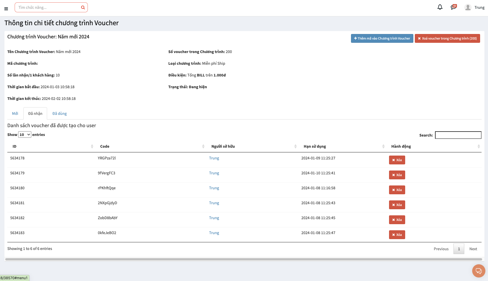 Trong chi tiết chương trình Voucher và phần "**Danh sách Voucher đã nhận**" sẽ thêm cột "**Hạn sử dụng**" của từng voucher