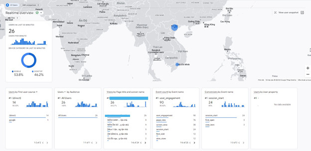 Ví dụ:  Số người hoạt động trong 30 phút trước (so với thời điểm hiện tại), số người thao tác với các màn hình tương ứng nào (% tương ứng từng màn hình, thời gian trung bình), số lượng Users theo từng quốc gia,...