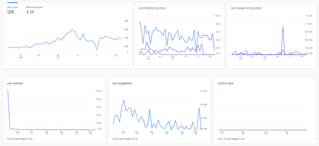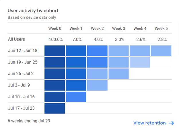 * **User retention by cohort :** *Cohort Analysis (Phân tích tổ hợp)* là một kỹ thuật phân tích trong Marketing tập trung vào việc phân tích hành vi của một nhóm người dùng / khách hàng có chung một đặc điểm trong một khoảng thời gian nhất định, từ đó khám phá những hiểu biết sâu sắc về trải nghiệm của những khách hàng để cải thiện những trải nghiệm đó. Đây là chỉ số thể hiện phần trăm giữ chân người dùng theo thời gian.